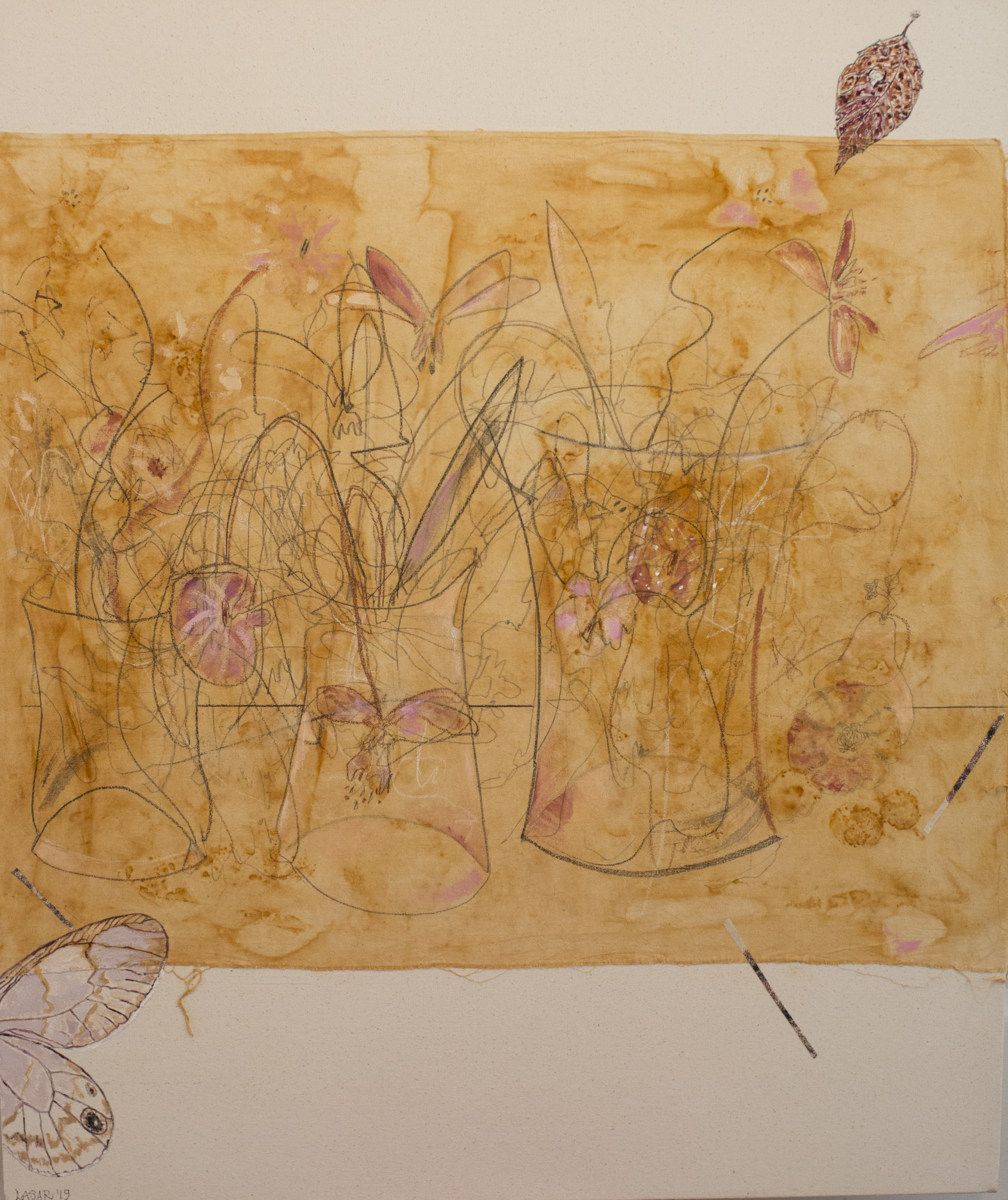 Still Life with Pomegranate, Mixed Media on Muslin on Canvas, 36×30, 2019