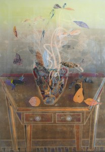 SOLD White Table Still Life wih Vases, 1/1, ’16, 44X30, Monotype and mixed media, $3800